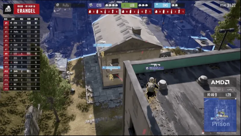 决赛圈,CTG占据圈中心高楼,先将SMS淘汰出局,再将LEG三人淘汰,CTG成功吃鸡。